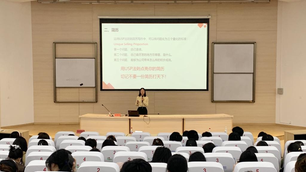 在简历制作指导讲座上,刘贵花用USP法则详细介绍了简历的基本结构以及8大要素的呈现方式,讲解如何通过细节优化提升简历的吸引力和个人竞争力。她强调,一份优秀的简历不仅要清晰明了,还要能够充分展现求职者的个人特色和职业优势。同时们不能盲目使用同一份简历应对所有求职机会,而是应该根据求职岗位的具体要求、个人的实际情况以及职业特点进行个性化的设计和调整,以实现“简职”匹配、“人职”匹配。