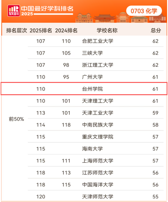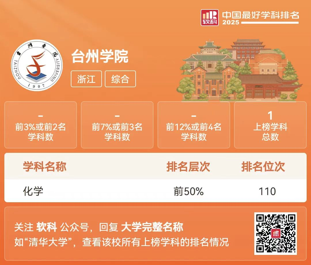2025年10月15日,高等教育评价专业机构软科正式发布“2025软科中国最好学科排名”。榜单显示,全国共有517所高校的5344个学科点上榜。公司化学学科在此次排名中位列全国高校并列第110名,并在浙江省高校中排名第8位。这一成绩标志着化学团队建设再上新台阶,是继2023年入选软科世界一流学科、2024年进入ESI全球排名前5‰后的又一重要突破。