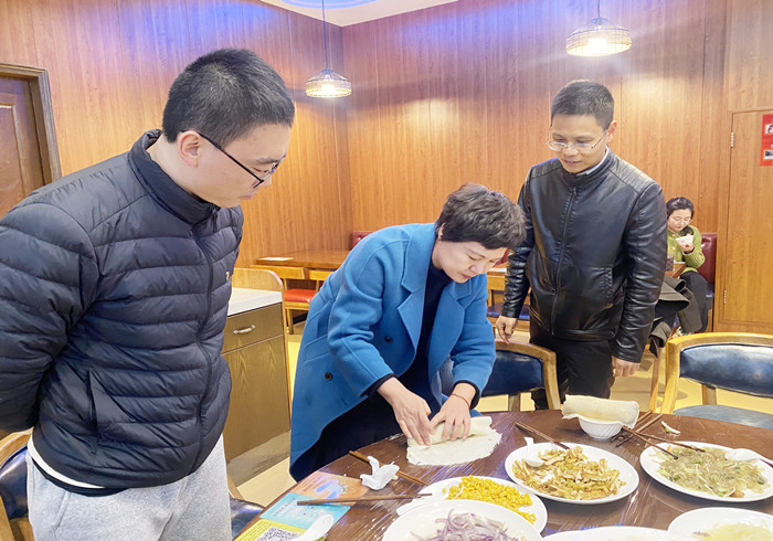 活动现场气氛热烈,看到满桌热气腾腾、色泽丰富、精美菜肴时,教职工都食指大动,把自己想吃的菜品包进香软的皮中,有包得小巧精致的,有包成大胖子的,也有直接包成一团的。大家一边吃着食饼筒,一边谈论着、交流着、欢笑着,暖胃又暖心。