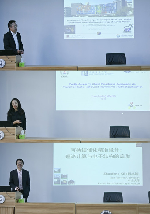 邝福儿教授作题为“具有阻转异构现象的碳-氮轴手性膦配体及其相关N-配位的协同作用研究”的学术报告。他向在座教师展示了他们课题组如何实现一系列含有阻转异构现象的碳−氮轴手性膦配体的合成并成功应用于不对称铃木交叉偶联反应中,且以优异的对映选择性简洁高效地构筑了大位阻的邻位四取代联芳基轴手性化合物。此外,还通过DFT计算发现配体的咔唑骨架单元引起一个有趣的Pd-arene-walking特征,可有效的实现低能垒反应路径。