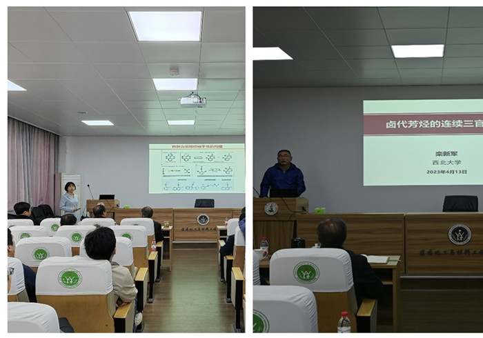 西北大学栾新军教授作题为“卤代芳烃的连续三官能化”的报告。他介绍了课题组怎样采用钯/降冰片烯协同催化的反应策略,同时引入两类亲电试剂,实现了简单碘代芳烃的连续三官能团化的研究进展。
