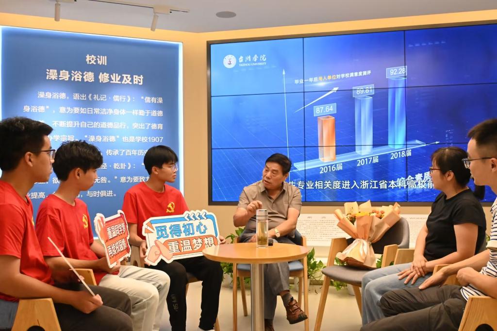 活动伊始,余彬彬代表公司向潘富友表示了欢迎,并且向大家介绍了本次活动的目的及访谈嘉宾的基本情况。随后,实践队队员们就家乡历史、求学经历、工作经历等方面内容对潘富友进行了采访交流。潘富友从公司发展情况讲起,追忆往昔岁月,公司由过去普普通通发展到如今的声名远扬,言语中无不洋溢着对台院近些年迅速发展的欣喜。随后,潘富友就自身优秀的教学水平向同学们分享了一些学习方法以及学习重点,告诫同学们要重视对基本功的学习,更是结合生活实例教导同学们要学会将理论知识充分应用于实践之中。