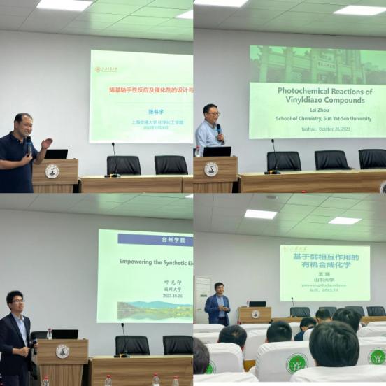中山大学周磊教授作了题为“Photochemical Reactions of Vinyldiazo Compounds”的报告。他重点讲解了乙烯基二氮化合物做为合成子的光化学反应,包括乙烯基二氮化合物作为自由基受体的反应、重氮官能团的光氧化还原反应等。