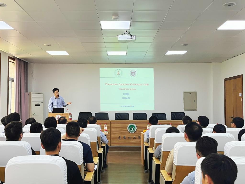 随后,南京大学朱成建教授讲述了他们发展的基于光化学的羧酸脱氧酰基自由基化新方法,以及由此衍生的一系列新型过渡金属与光氧化还原协同催化体系在有机合成中的应用。上海师范大学赵宝国教授则介绍了受生物过程启发的基于维生素B6骨架的仿生不对称催化在合成手性化合物方面的研究成果。