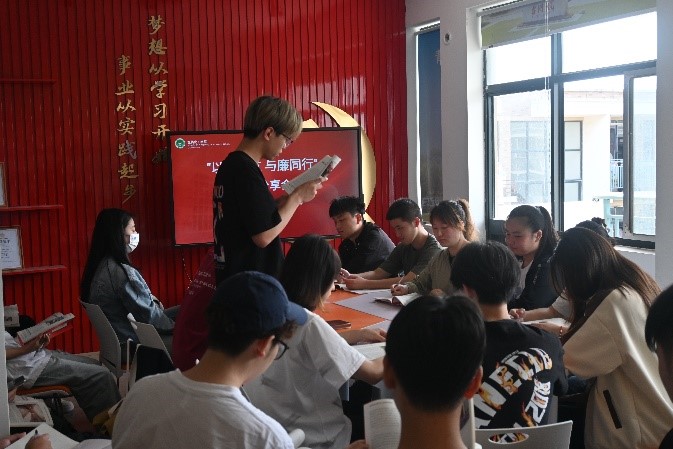 活动中,辅导员张朋向大家推荐了《清风传家》和《廉洁自律小故事反腐倡廉大道理》两本书籍并分享了读书感悟。《清风传家》一书中张富清、钟南山等25位英雄模范党员用自己的行动践行了对党和国家的忠诚,对家庭的责任感,以及对事业的执着追求。他们的故事激励着大家见贤思齐,从中汲取人格力量。《廉洁自律小故事反腐倡廉大道理》通过一个个生动的故事,教育引导大家要以案为鉴,引以为戒,持续强化自身约束和管理,严守各项党纪法规,净化社交圈、生活圈和朋友圈,培养高尚节操和健康向上个人爱好。