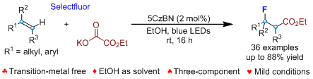 6. X. Wang, Y. Chen, P. Liang, J.-Q. Chen,* J. Wu,* Synthesis of β-Fluorocarboxylic Esters via Organophotoredox-Catalyzed Fluoroalkoxycarbonylation of Alkenes in EtOH, Green Chem., 2022, 24, 5077. (SCI一区)