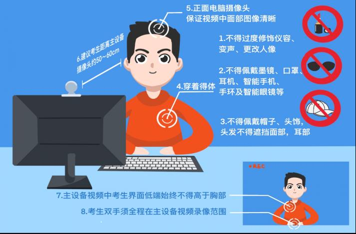 (1)面试第一机位要求。第一机位设备用于面试时考生与复试专家互动,考生本人面对摄像头,建议距离摄像头50-60cm,保持坐姿端正,面部、上半身及双手在画面中央清晰可见(第一机位设备建议使用电脑+有线宽带)。