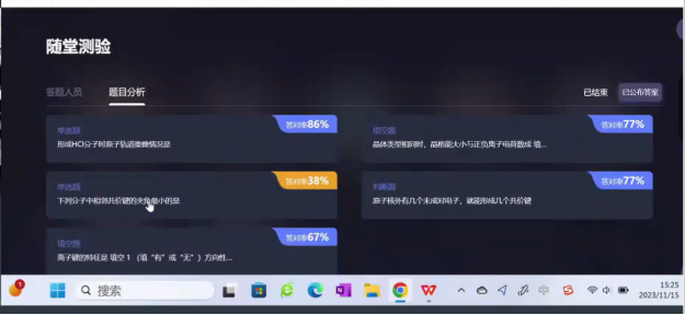 在这次同步课堂活动中,陈素清老师紧紧围绕化学键理论,将教学内容进行重组形成条理清晰、浅显易懂的课点,通过大量案例阐述了化学键理论及物质分子结构的分析,并充分利用智慧树同步课堂教学工具,进行签到、随堂测验、抢答、投票等,实现两校师生实时交流,积极互动,气氛活跃。同时,结合教学内容,陈老师将“中国量子化学之父”唐敖庆在理论化学中的贡献贯穿其中,带领同学们感悟科学家精神和思想价值,实现思政教育与专业课程的深度融合。