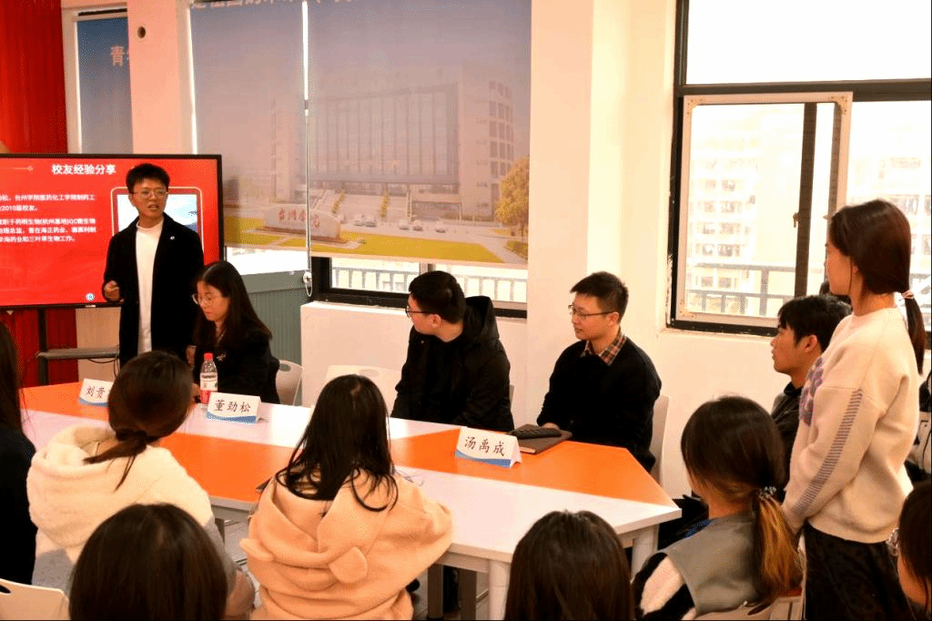 座谈会上,两位员工侃侃而谈,分析了医化行业目前的就业形势和未来发展前景,结合自身的学习和就业经历,与学弟学妹们分享多年来的职场体验和生涯感悟。董劲松希望学弟学妹们要珍惜在校时光,脚踏实地,学好专业课程,为未来的选择打好坚实的基础。严新涛勉励同学们要始终保持学习的热情和激情,在大学这个试错成本相对较低的时期,多多把握机会,不断丰富自己的经历、阅历,做到知行合一。答疑环节,两位员工就同学同们提出的如何转换员工到职场的心态、怎么看待跳槽、怎么平衡学习与工作等问题一一解答,现场气氛热烈。座谈会的最后,刘贵花向两位优秀员工在百忙中抽出时间回到校园,为同学们带来这堂别开生面的座谈会表示感谢,同时也希望同学们向优秀员工看齐,努力成就属于自己的未来。