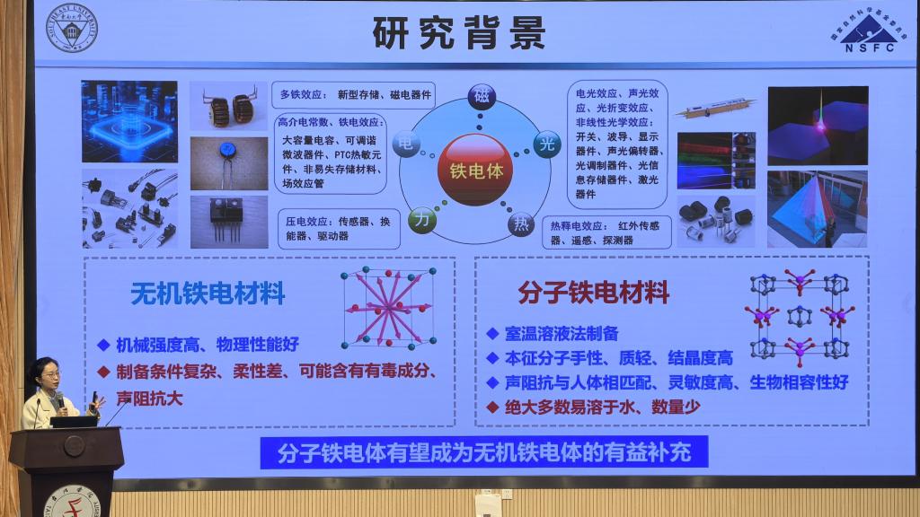 张教授的报告围绕铁电材料在信息存储、能量转换及传感等领域的广泛应用展开。她指出,尽管无机压电陶瓷和压电聚合物目前占据主导地位,但这些材料的不可降解特性导致了植入式电子器件的二次手术风险。针对这一挑战,张教授及其团队致力于开发基于可生物降解材料的植入式瞬态电子器件,特别是天然压电生物材料的应用。通过创新的化学设计,包括氢/氟取代策略和晶体工程,张教授团队成功开发了一种具有高压电性的可生物降解铁电分子晶体。这一成果不仅为可降解植入式电子医疗器件提供了新的材料选择,同时也展示了分子压电材料在促进人类健康方面的巨大潜力。